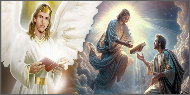 Este ángel sin duda es Cristo. La nube que lo envuelve nos recuerda la nube del Antiguo Testamento, donde Dios custodiaba el templo. El arcoiris es el pacto que Dios hizo con Israel después del diluvio. Su rostro como el sol y sus pies de fuego están llenos gloria y esplendor. El librito es el Evangelio. Un pie en el mar y otro en la tierra es su poder sobre toda la creación.