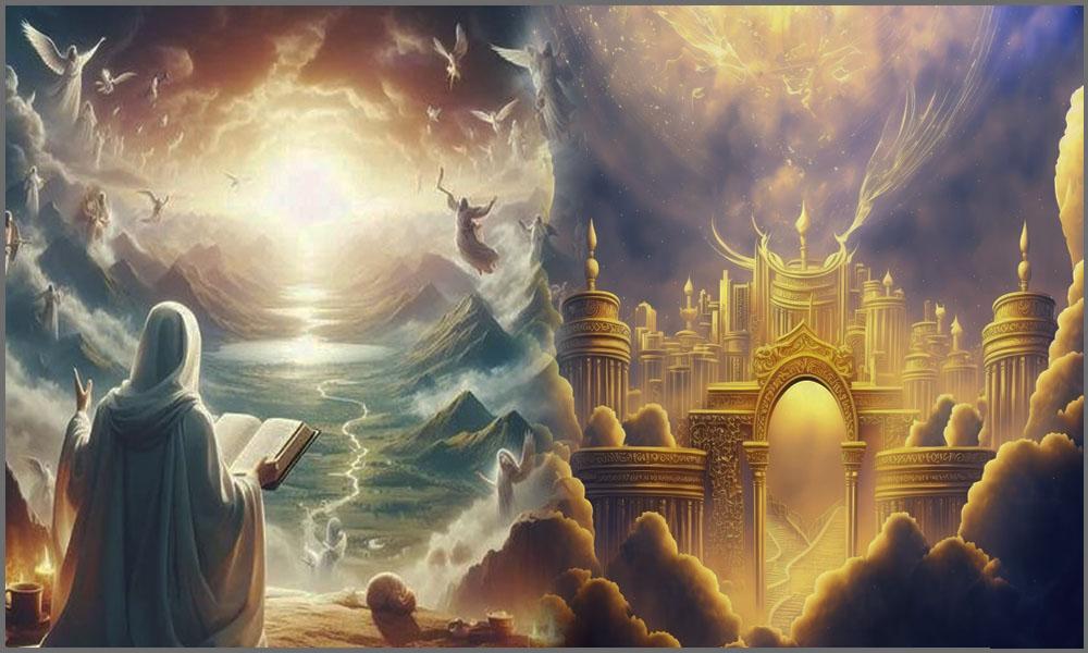 Un ángel muestra la nueva Jerusalén, venida del cielo, puesta en un monte grande y alto. Semejante a piedra de jaspe y diáfana como cristal, con un muro alto, con varias puertas y ángeles en ellas. Otro ángel con una caña de oro la mide y sus dimensiones son enormes. La ciudad no tenía templo pues Dios mismo y el Cordero son el templo mismo.