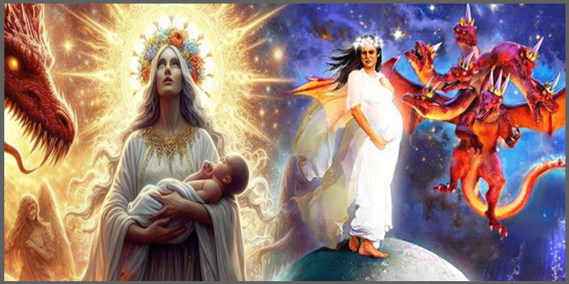 Aparece en el cielo una gran señal: una mujer vestida de sol con la luna a sus pies. Sobre su cabeza una corona de siete estrellas. Está embarazada con dolores de parto. Y aparece otra señal: un gran dragón escarlata que tiene siete cabezas y diez cuernos y en sus cabezas siete diademas. Su cola arrastraba la tercera parte de las estrellas del cielo y las arrojó sobre la tierra. El dragón estaba frente a la mujer esperando devorar a su hijo. Y ella dió luz a un hijo varón que regirá con vara de hierro a todas las naciones y su hijo fué arrebatado para Dios y para su trono. (Ap. 12:5). La mujer huye al desierto, preparado por Dios y es sustentada allí por varios días.