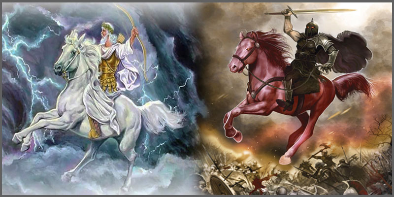 Este jinete simboliza un líder de falsa paz: el anticristo. Su caballo blanco significa realeza y poder triunfador. Detrás de él vienen tres jinetes trayendo desgracia al mundo.