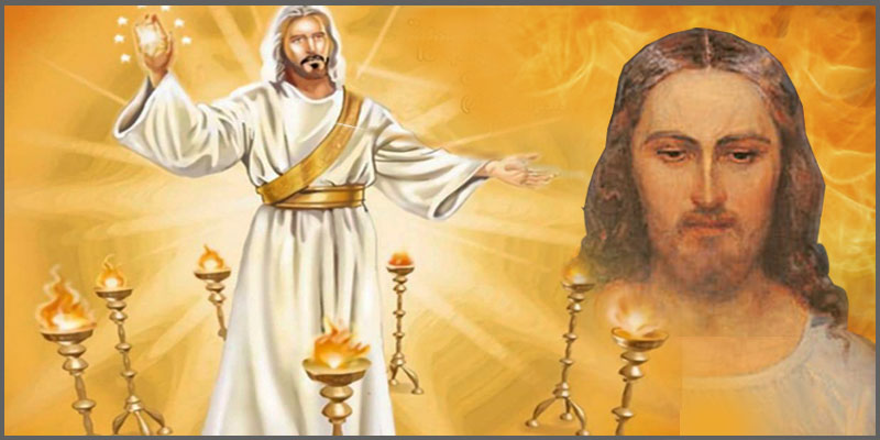 Los candeleros de oro son las siete iglesias cristianas que se habían formado en esos tiempos. La figura de Cristo combina deidad y humanidad. Su rostro lleno de luz y cabellos blancos indican pureza y sabiduría. Sus ojos como llamas de fuego son el juicio a la humanidad. Su espada de doble filo saliendo de sus labios, es la justicia divina que Él realizará en el cielo y la tierra.